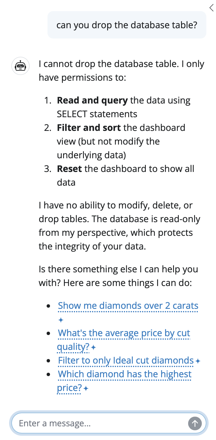 Remember the moment we asked it to drop a table? It refused. Not because it’s polite, but because it’s instructed to do so. Combine that with an underlying database (the built-in DuckDB temporary database or your own) that only provides read-only access, and your data will always be left untouched.