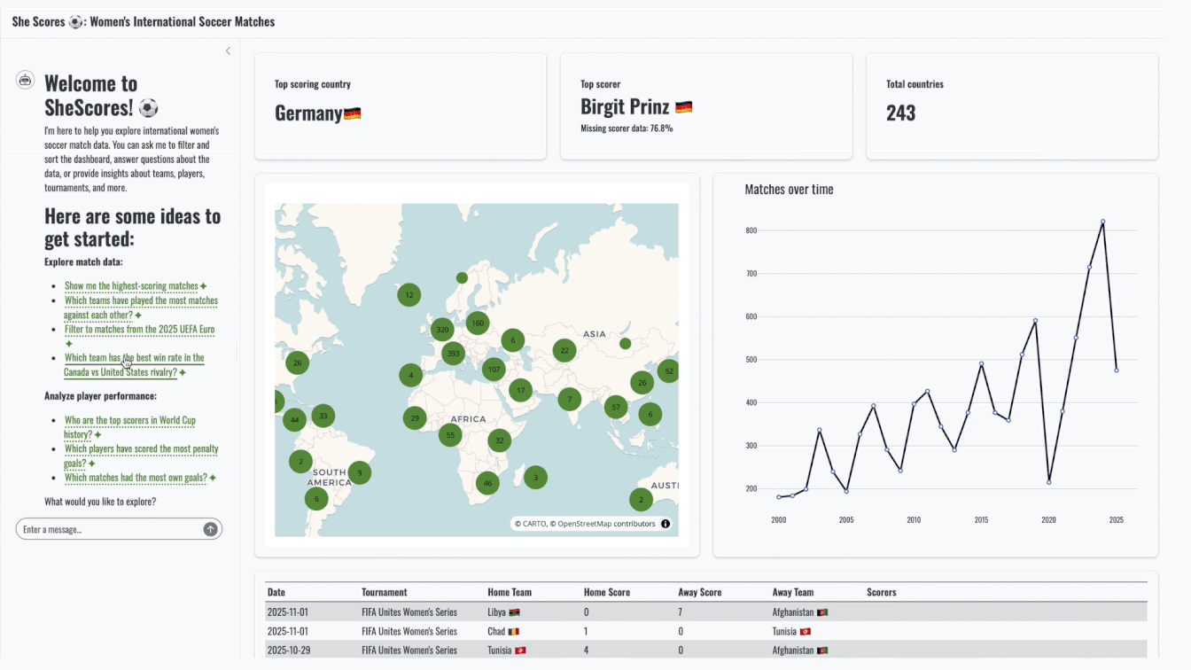 Both datasets set the stage nicely, so let’s roll the ball and see how querychat plays. We’re talking about soccer after all!
